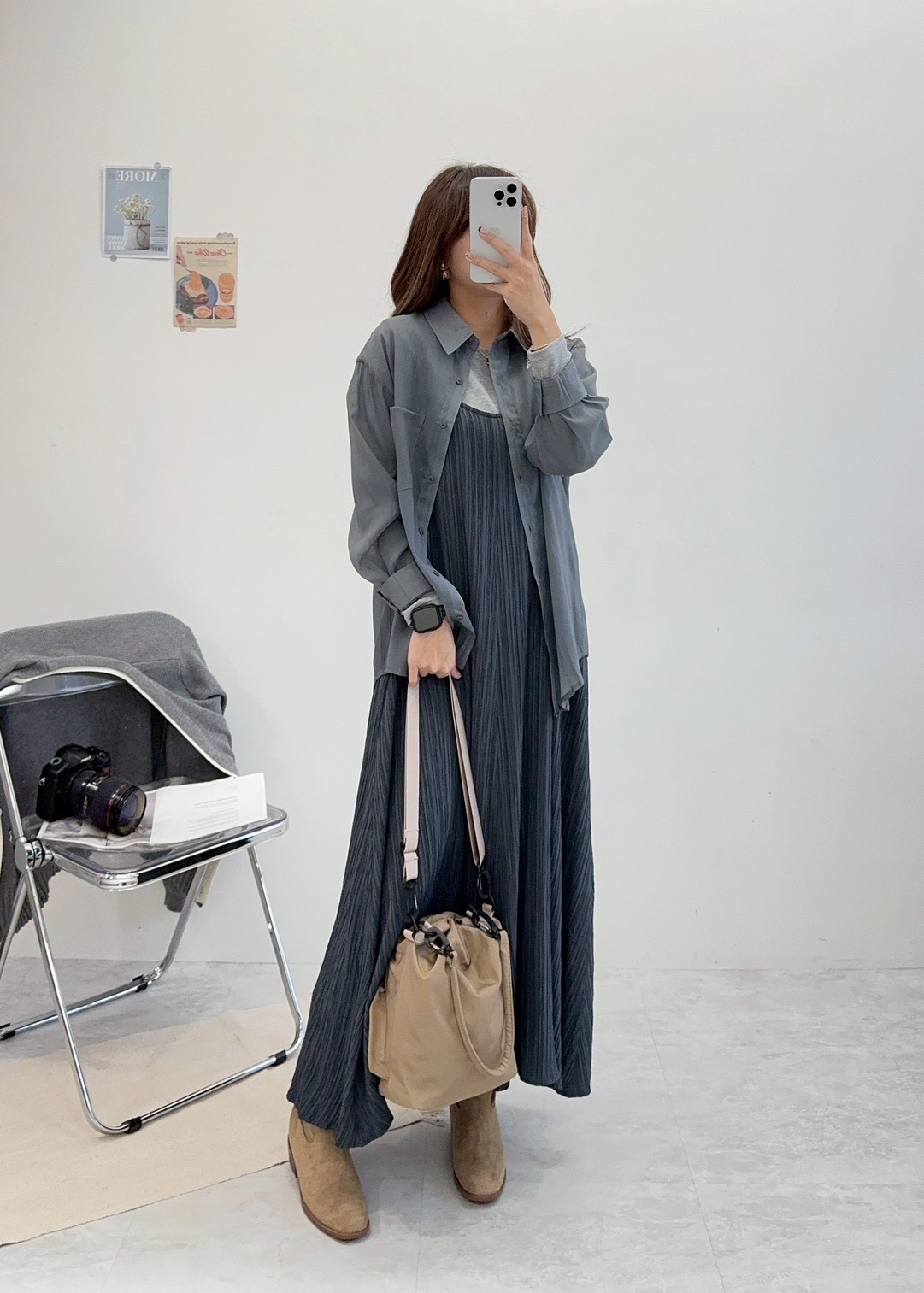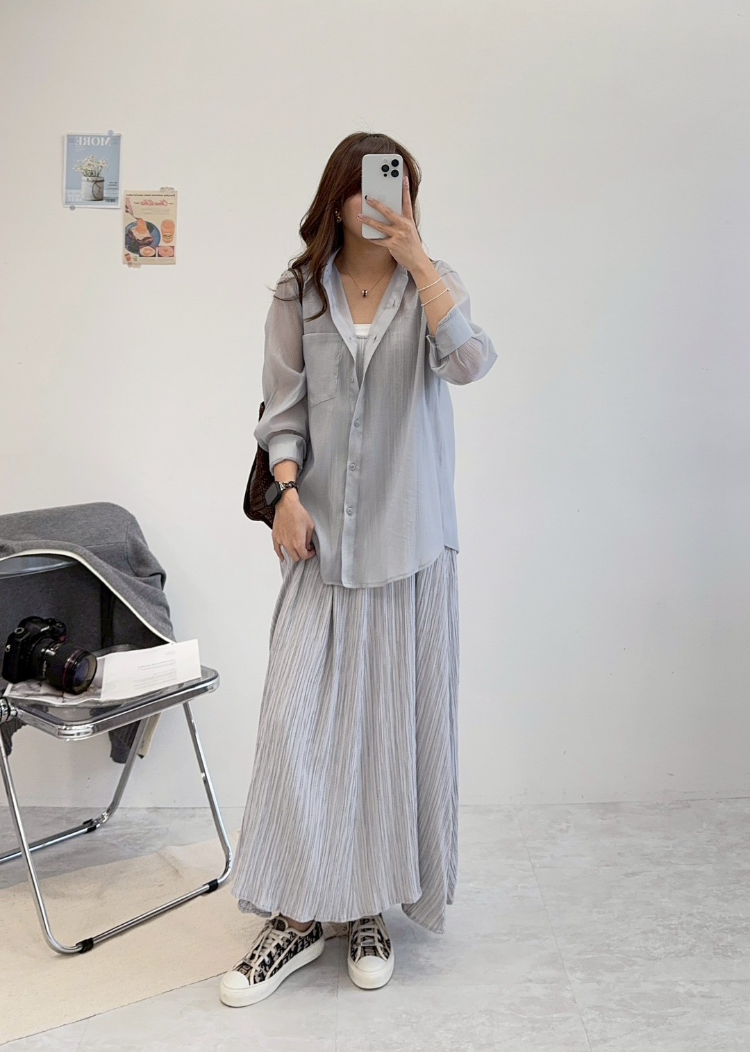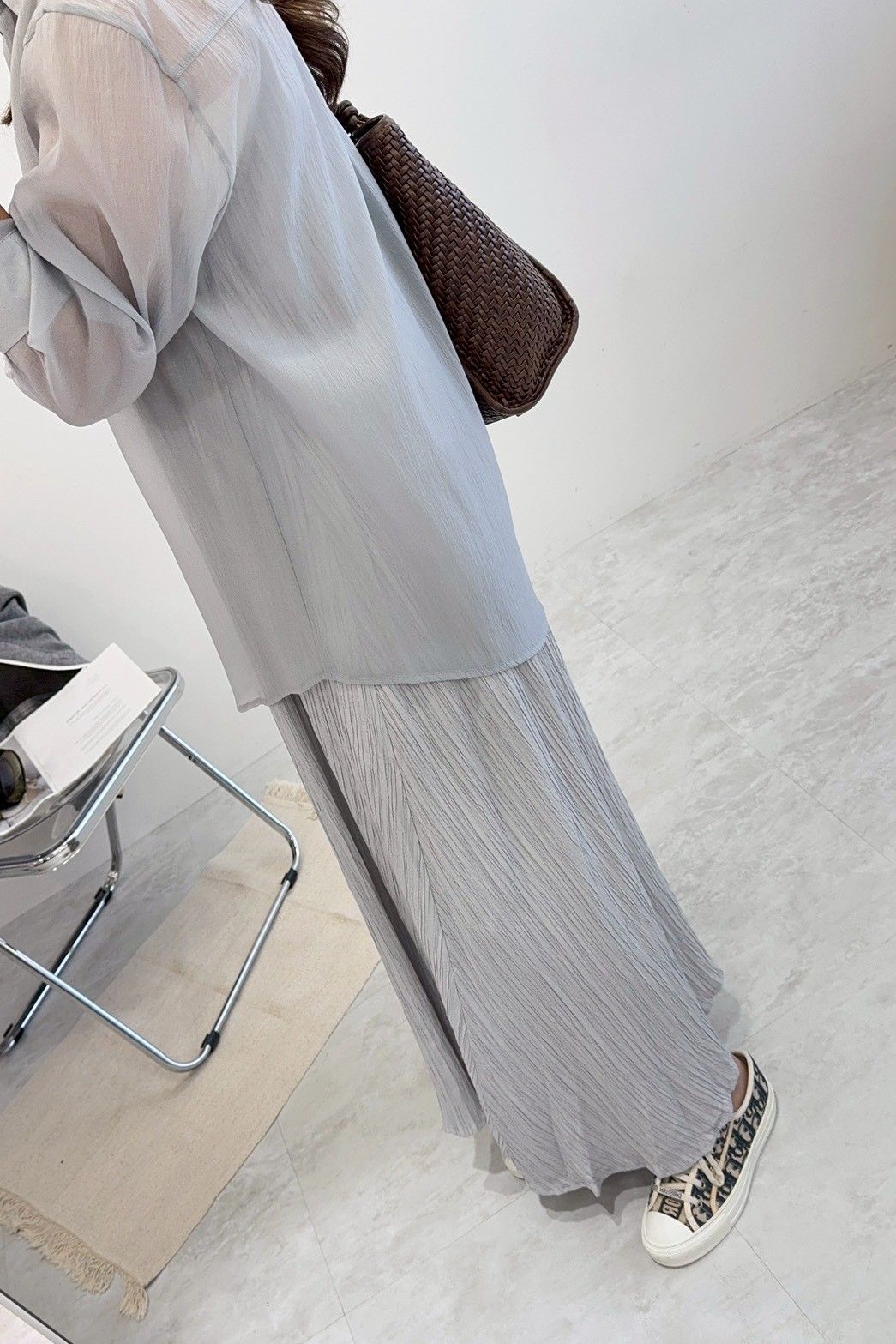 三宅文青百褶兩件套|霧灰襯衫 × 飄逸百褶裙。