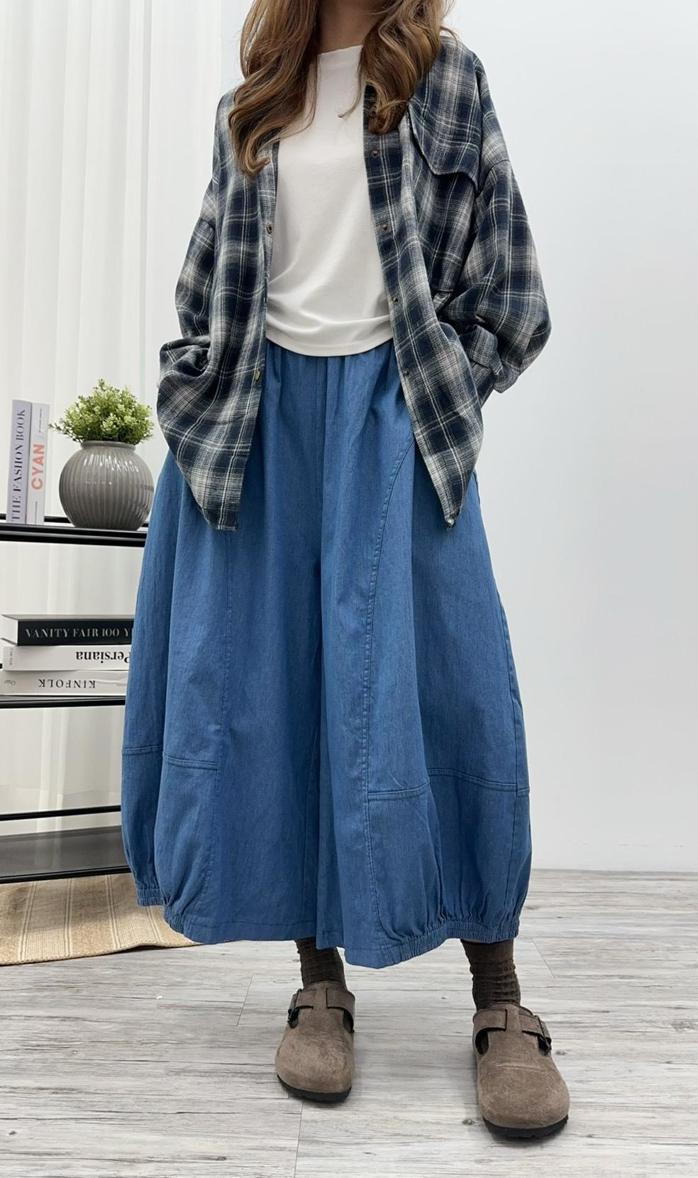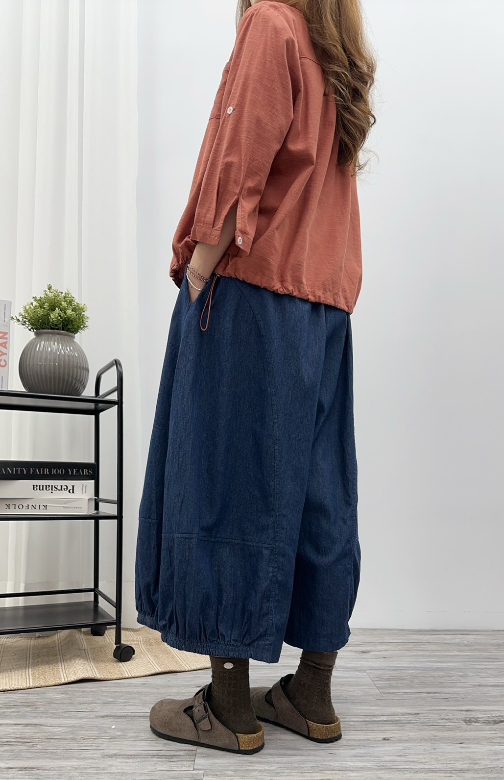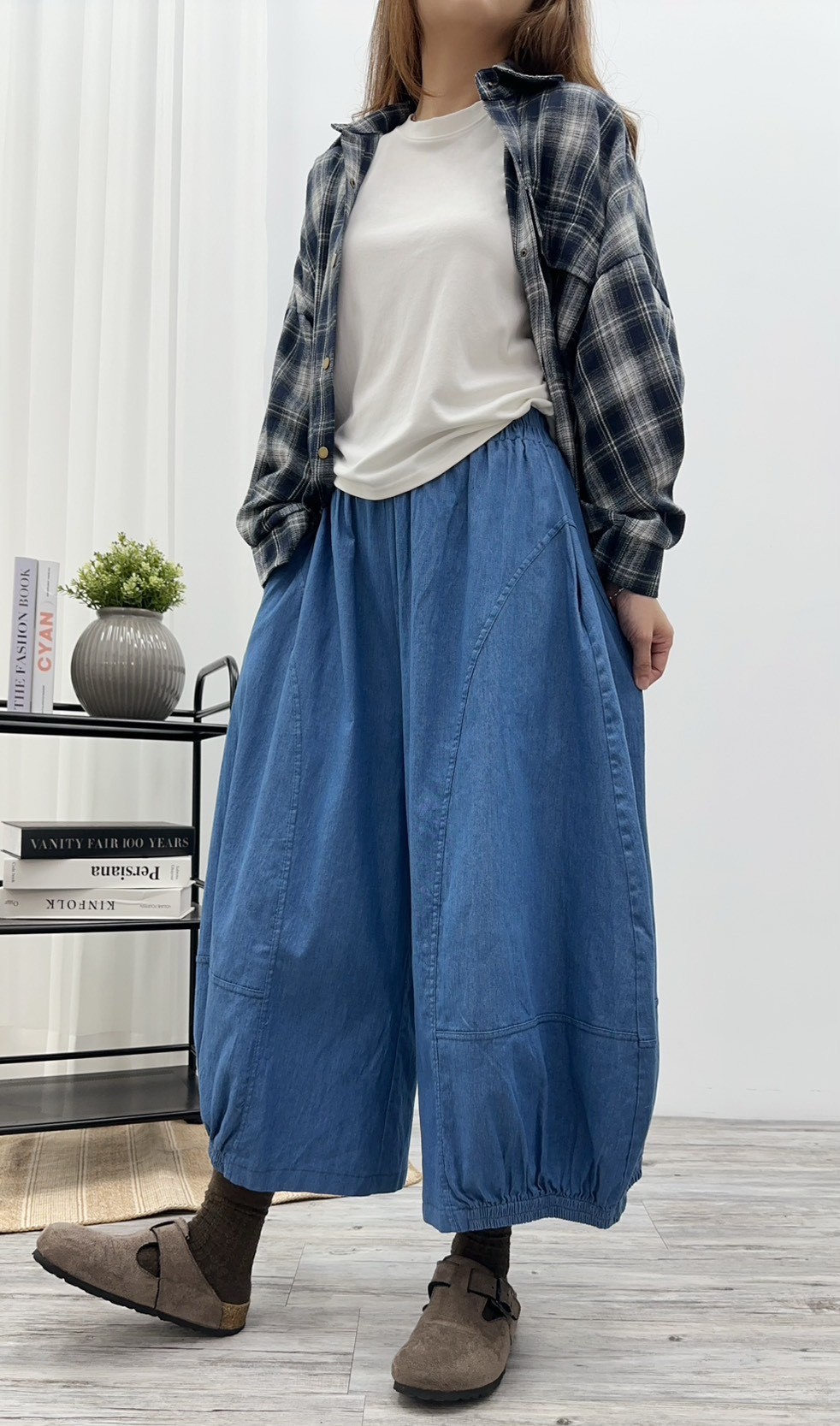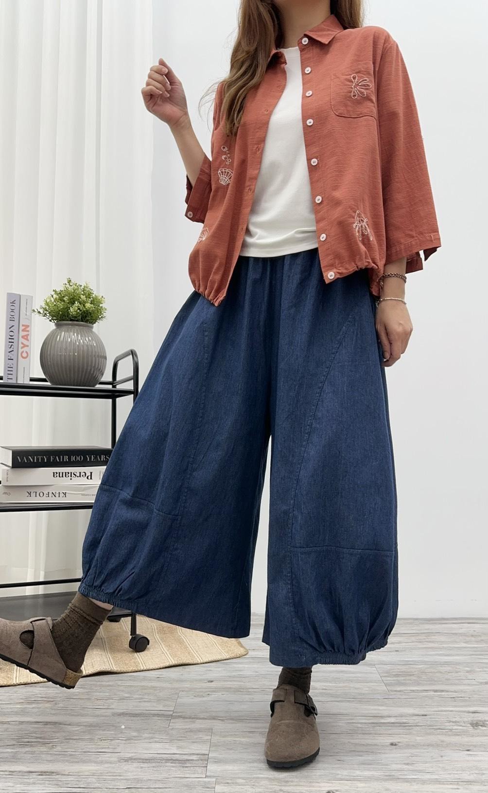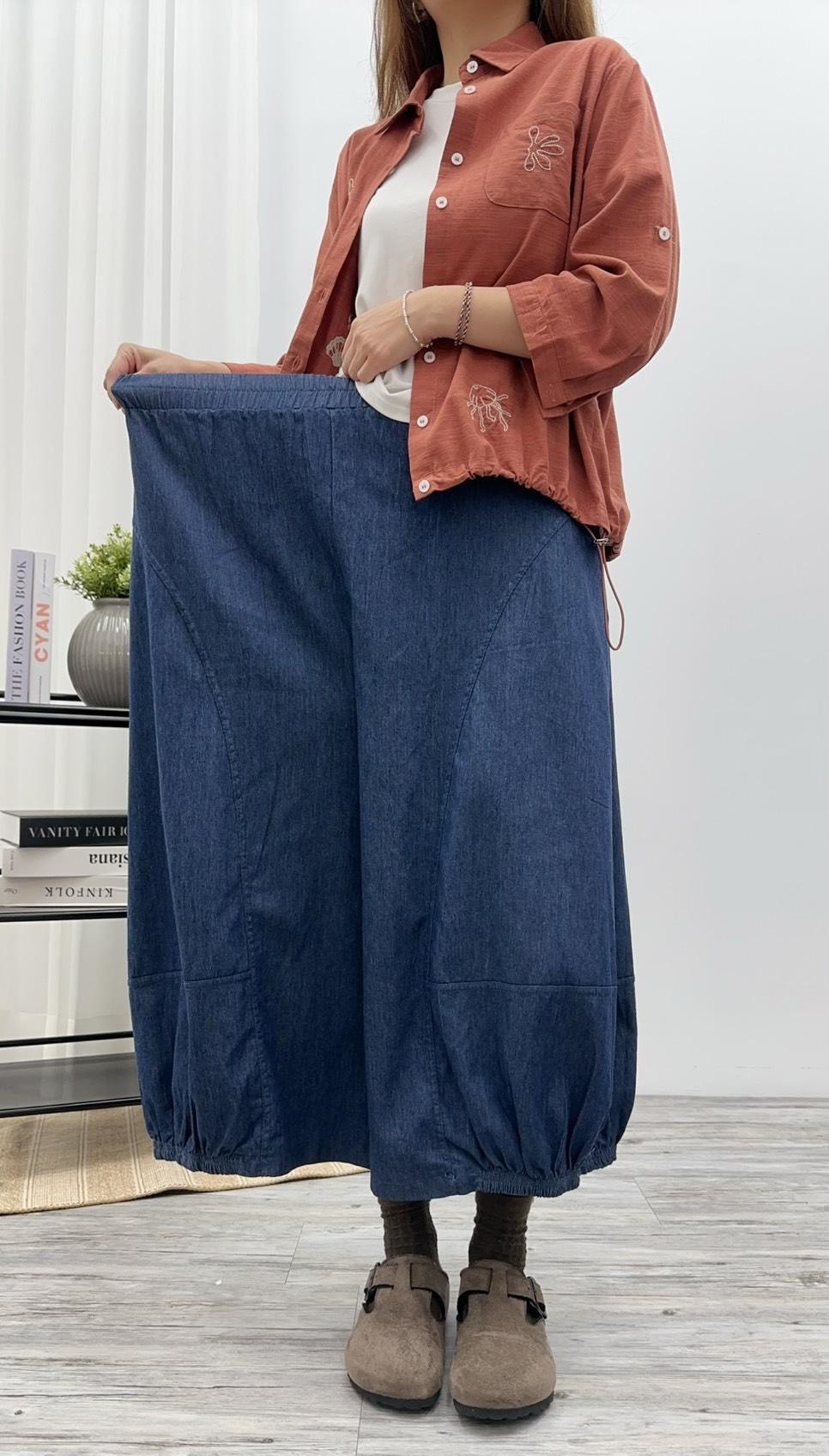 #單寧氣球褲 #丹寧長褲 #高腰褲 #鬆緊腰設計 #休閒褲 #