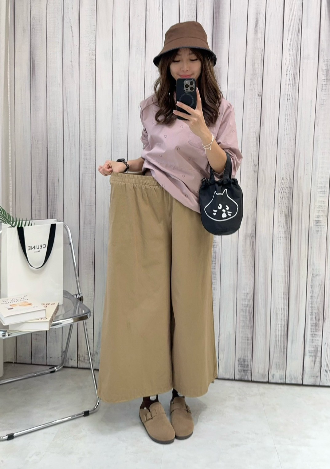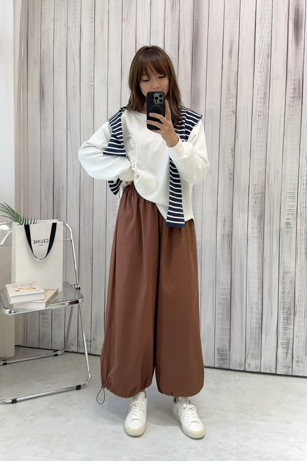 暖色散擺抽繩寬褲|腰鬆緊 × 抽繩褲腳設計。